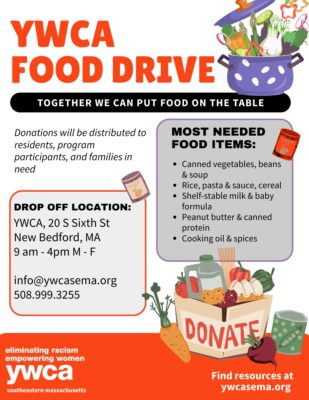 Drop offs are accepted at the YWCA office (20 S. Sixth St, New Bedford) Monday – Friday 9am – 4pm. The food drive will continue as long as support is needed.