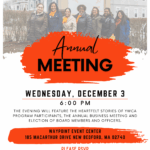 YWCA Annual Meeting Wednesday December 3, 2025 6PM Waypoint Event Center 185 MacArthur Dr, New Bedford, MA Free The evening will feature the heartfelt stories of YWCA program participants, the annual business meeting, and election of board members and officers. RSVP – please RSVP by 11/23/25