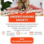 Wednesday, May 13, 2026 12:00 – 1:00 PM YWCA Southeastern MA 20 South Sixth St New Bedford, MA FREE EVENT – RSVP a free workshop to discover practical tools to demystify the mechanics of anxiety and reclaim your sense of calm. Bring your own lunch! Presented by YWCA Mental Health Clinician Phoebe Marshall, M.Ed.