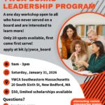 Saturday, January 31, 2026 9AM – 3PM YWCA Southeastern MA 20 South Sixth St New Bedford, MA 02740 $50, limited scholarships available A one day workshop open to all who have never served on a board and are interested to learn more! Enrollment is open to all but is focused on diverse communities: BIPOC, LGBTQ+,…
