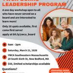 Saturday, January 31, 2026 9AM – 3PM YWCA Southeastern MA 20 South Sixth St New Bedford, MA 02740 $50, limited scholarships available A one day workshop open to all who have never served on a board and are interested to learn more! Enrollment is open to all but is focused on diverse communities: BIPOC, LGBTQ+,…